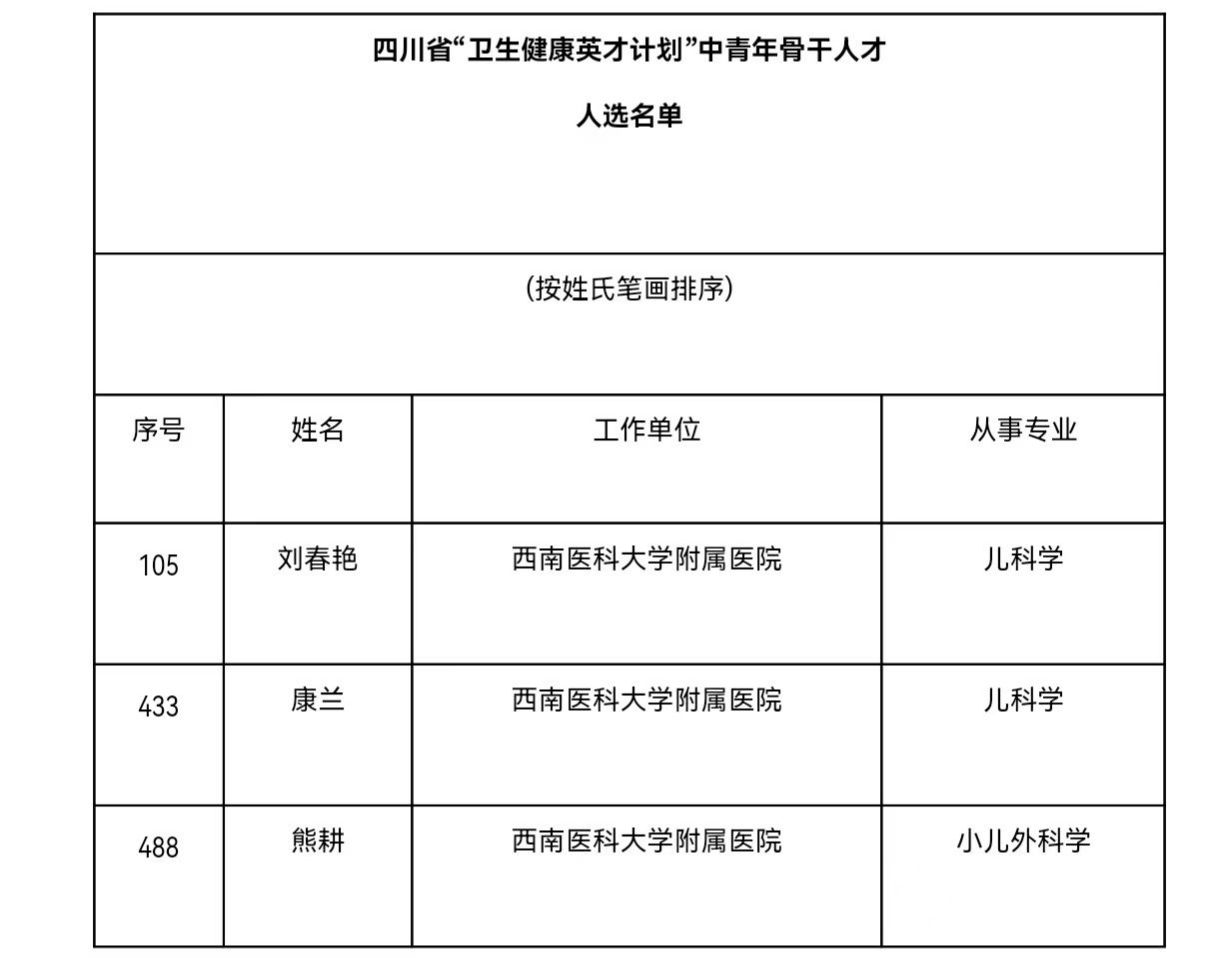 近日,四川省卫生健康委员会正式公布了2025年度“卫生健康英才计划”入选名单。经过严格推荐、评审与公示,我院儿童医学中心刘春艳主任医师、康兰副主任医师、熊耕副主任医师凭借扎实的临床功底、突出的科研创新能力及显著的行业影响力,成功入选“卫生健康英才计划中青年骨干人才”,是我院高层次人才队伍建设取得的又一重要成果。