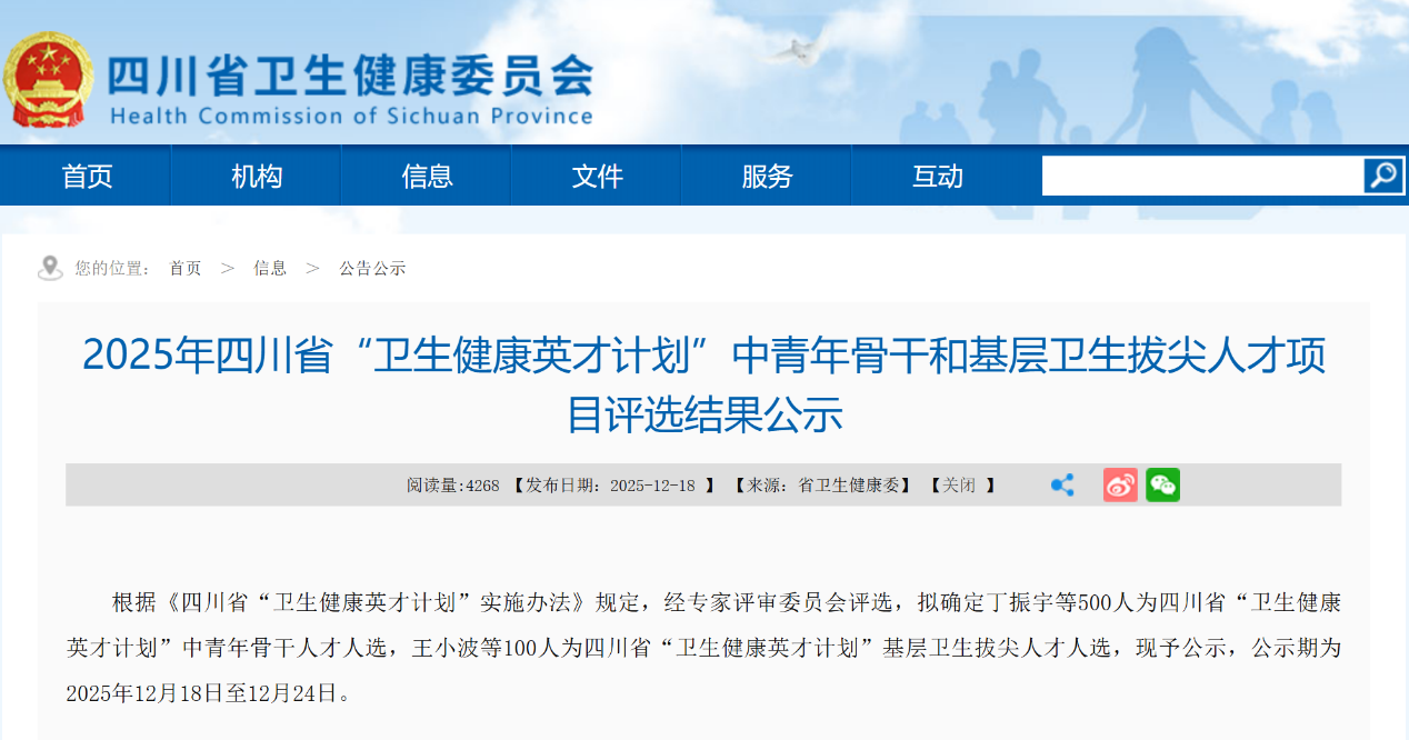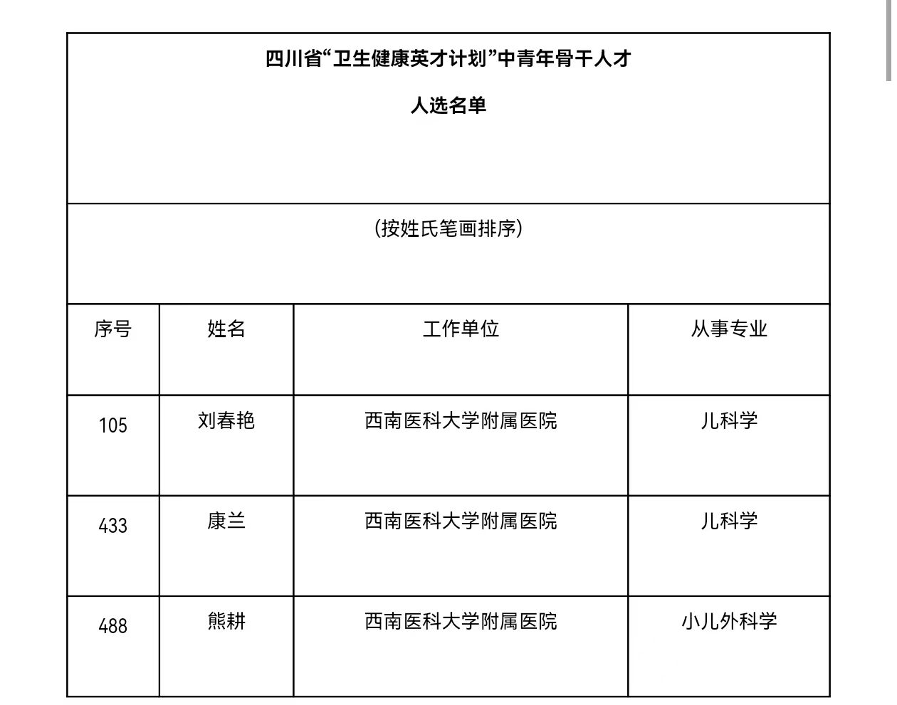 近日,四川省卫生健康委员会正式公布了2025年度“卫生健康英才计划”入选名单。经过严格推荐、评审与公示,我院儿童医学中心刘春艳主任医师、康兰副主任医师、熊耕副主任医师凭借扎实的临床功底、突出的科研创新能力及显著的行业影响力,成功入选“卫生健康英才计划中青年骨干人才”,是我院高层次人才队伍建设取得的又一重要成果。